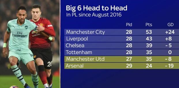 United sa v tejto sezóne proti tímom z top šestky tiež veľmi nedarí, vyhrali iba v jednom zo 7 takýchto duelov.