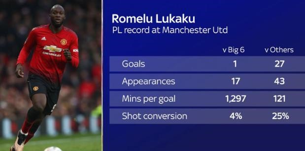 Lukaku strelil za United celkovo 28 gólov v 60 zápasoch Premier League, ale má na konte iba jeden gól zo 17 zápasov proti klubom z top šestky. Tento jediný presný zásah zaznamenal vo februári 2018 proti svojmu bývalému klubu Chelsea (United zápas vyhrali 2:1).