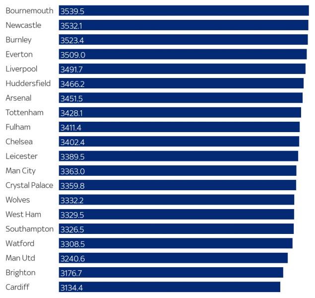 Čo sa týka nabehaných kilometrov, tak najvyššej anglickej súťaži v tejto chvíli dominuje Bournemouth s takmer 3540 kilometrami.