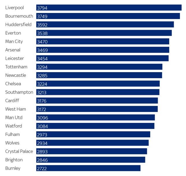Tu je lídrom Liverpool, ktorý má na konte celkovo 3794 šprintov. Na druhej strane Burnley zrealizovalo iba 2722 šprintov.