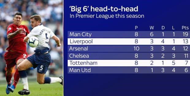 V tejto sezóne červení nazbierali v 8 zápasoch proti klubom z veľkej šestky trinásť bodov - iba Manchester City má na konte viac.