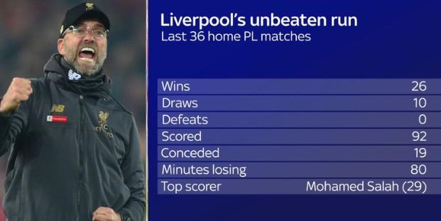 Ak zoberieme zápasy proti všetkým súperom, tak Liverpool na domácom ihrisku neprehral v ostatných 36 zápasoch anglickej Premier League. Je to jeho najdlhšia séria od rekordu medzi rokmi 1978 až 1980, kedy neprehral 63 ligových zápasov za sebou.