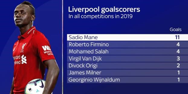 Až 11 z 20 gólov Maného padlo v kalendárnom roku 2019, čo je o sedem viac ako majú na konte jeho spoluhráči z útoku Roberto Firmino a Mohamed Salah.
