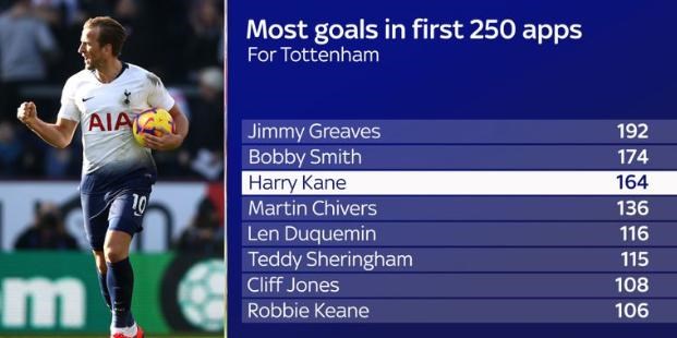 Kane má na konte 164 gólov v Premier League, čo je o 49 viac ako má na konte Teddy Sheringham, ktorý je druhým najlepším hráčom v poradí (iba v rámci Premier League).
