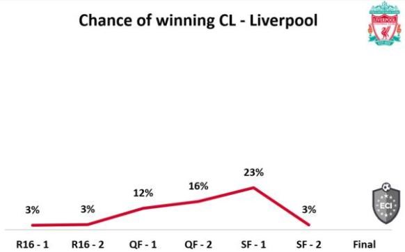 „Šance Liverpoolu na postup do finále Ligy majstrov sú aktuálne na úrovni 4 percent,“ povedal hlavný analytik spoločnosti Gracenote Simon Gleave.