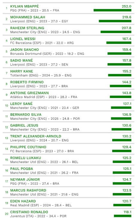 CIES Football Observatory priniesol rebríček stovky hráčov s aktuálne najvyššou transferovou hodnotou na trhu v top rámci top päťky európskych ligových súťaží. Prvé priečky okupuje trojica útočníkov: Kylian Mbappé (€252M), Mohammed Salah (€219M) a Raheem Sterling (€208M).