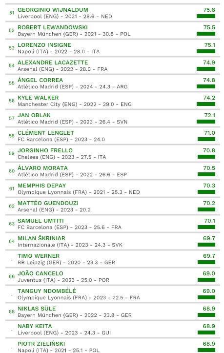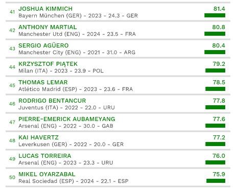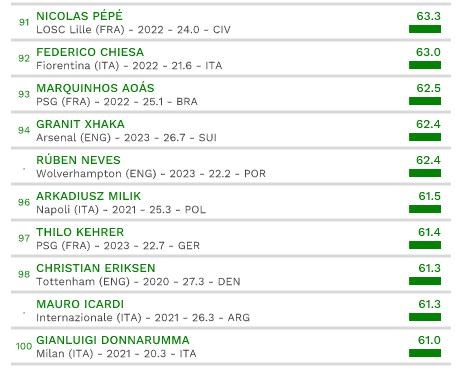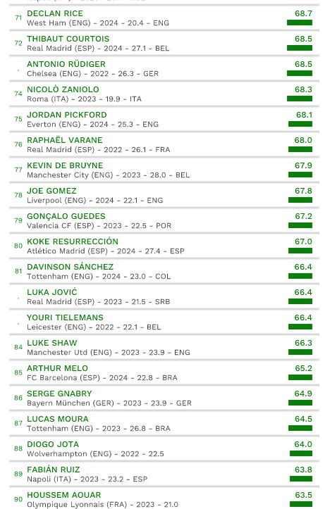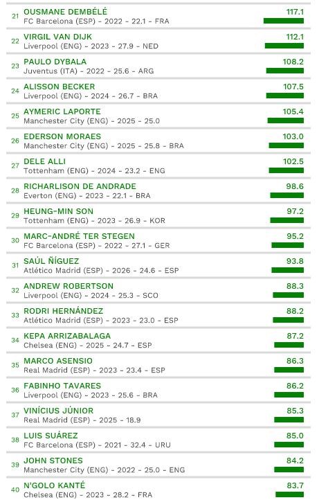 Najvyššie ohodnoteným brankárom je Alisson Becker (€107M). Medzi obrancami dominuje Trent Alexander-Arnold (€130M) a medzi záložníkmi Paul Pogba (€125M). Lionel Messi (€167M) je najvyššie z hráčov nad 31 rokov, Cristiano Ronaldo (€118M) je jednotkou medzi hráčmi od 33 rokov a viac.