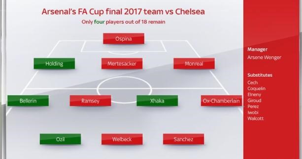 Nielen že na lavičke sedí iný manažér, keď Arsena Wengera nahradil Unai Emery, ale káder kanonierov opustilo až 14 z 18 hráčov, ktorí si vtedy zahrali vo Wembley.
