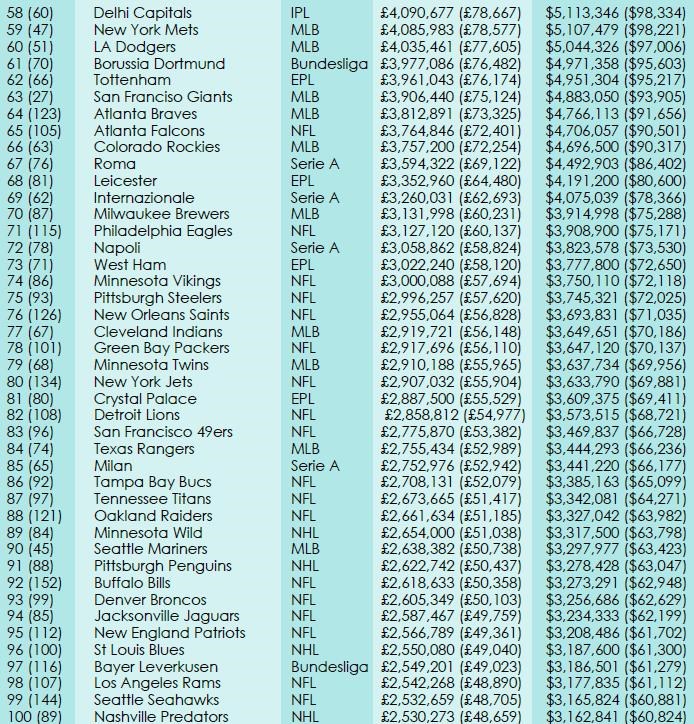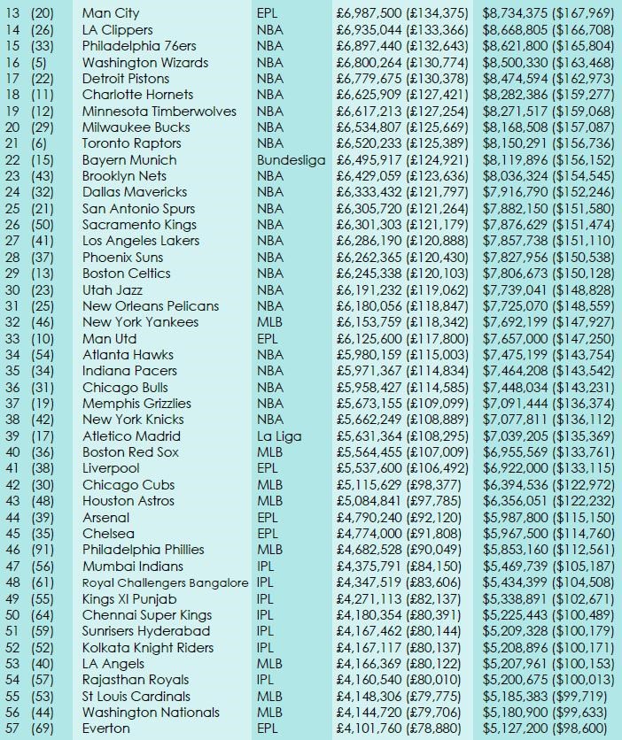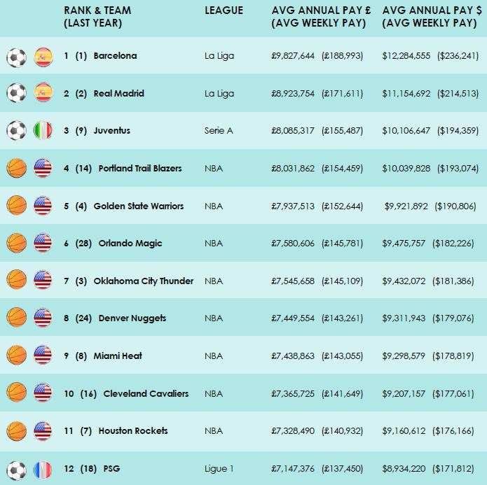 Na prvých dvoch priečkach sú podľa očakávania španielske veľkokluby FC Barcelona (9,83 mil.libier) a Real Madrid (8,92 mil.libier). Tretí je taliansky Juventus, ktorý oproti minulému roku postúpil až o šesť priečok vyššie (8,09 mil.libier). Zostávajúce kluby z top desiatky sú z basketbalovej NBA.