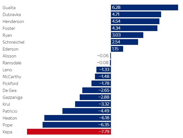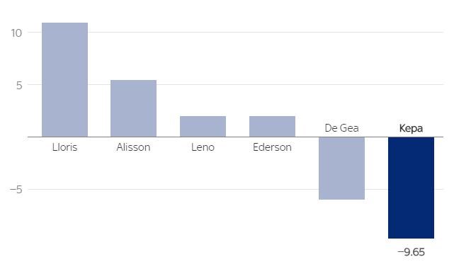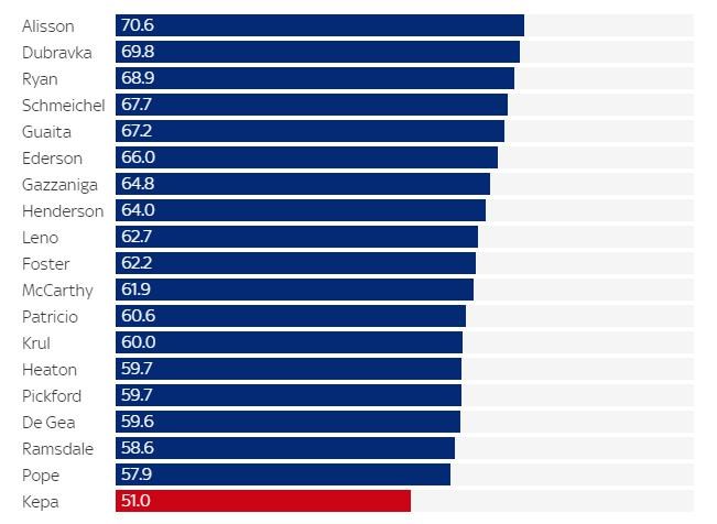 Štatistiky z tejto sezóny naznačujú, že priemerný gólman by mal inkasovať 22 gólov zo striel, ktorým čelil. Kepa inkasoval až 30.