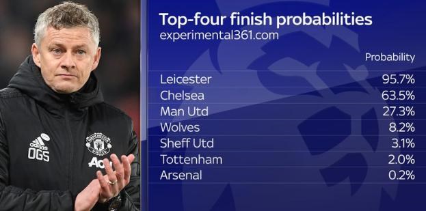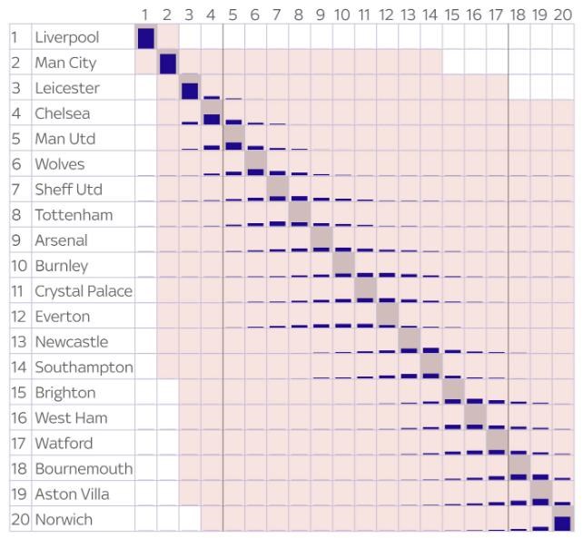 Dátový guru Ben Mayhew zo stránky experimental361.com nasimuloval všetky možné výsledky zostávajúcich 92 zápasov aktuálnej sezóny Premier League, aby zistil najpravdepodobnejšie umiestnenie klubov v konečnej tabuľke.