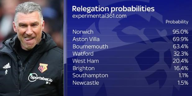 Čo sa týka zostupu, tak algoritmus dáva Norwichu šancu na záchranu iba päť percent. Šance Aston Villy na záchranu medzi elitou je 30 percent a zle je na tom aj Bournemouth, ktorého šance sú na úrovni 36 percent.