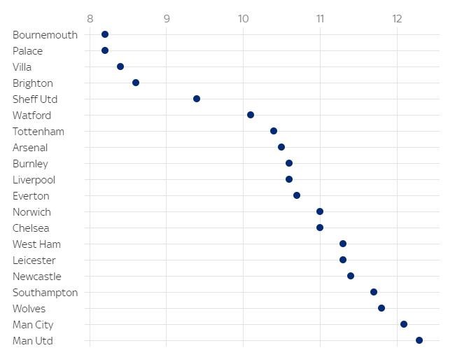 Leicester a Chelsea čakajú relatívne priemerní súperi (11,0 resp. 11,3), ale modrí si ešte zahrajú až s troma tímami z aktuálnej top šestky. Leicester a Manchester United odohrajú už iba jeden takýto duel a bude to práve ich vzájomný zápas počas posledného kola súťaže.