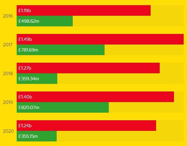 Výdavky a príjmy klubov z Premier League v posledných piatich prestupových oknách