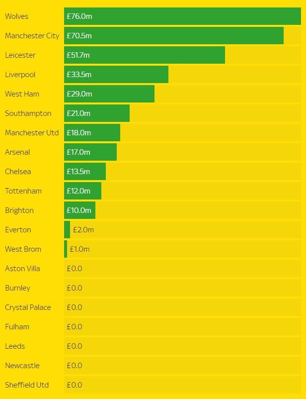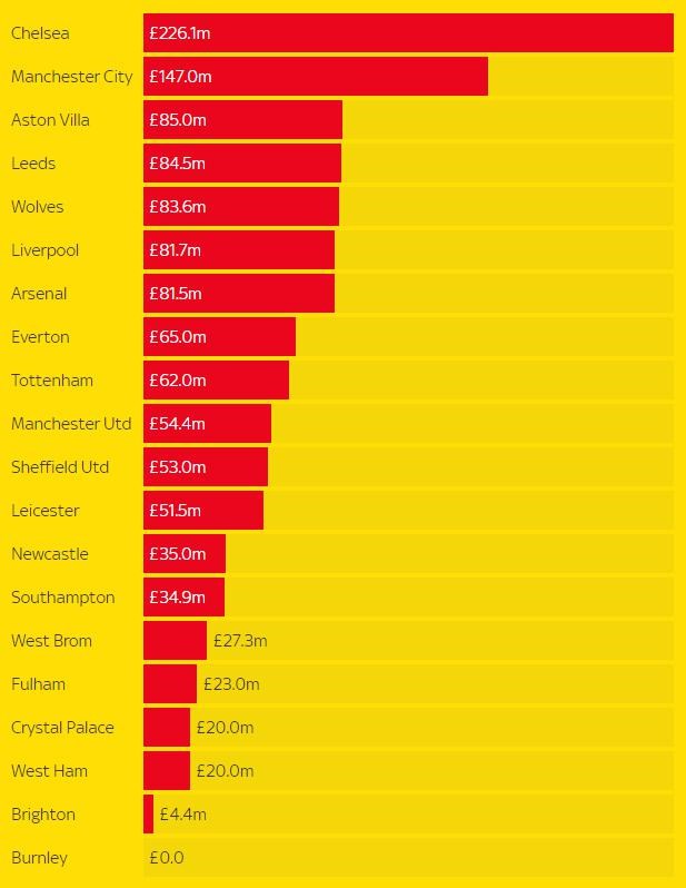 V čistých výdavkoch klubov je tak na prvej priečke londýnska Chelsea s 212,6 miliónami libier. S takmer vyrovnaným rozpočtom leto uzavreli Wolves. V pluse skončila trojica West Ham, Brighton a West Ham.