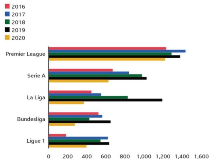 Anglická najvyššia súťaž svojimi investíciami jednoznačne predbehla ostatné top európske súťaže. Zástupcovia Premier League preinvestovali dvakrát viac financií ako La Liga, Bundesliga či Ligue 1 a dvakrát viac ako Serie A.
