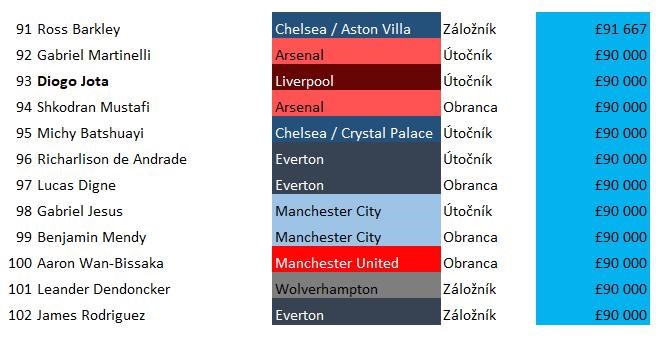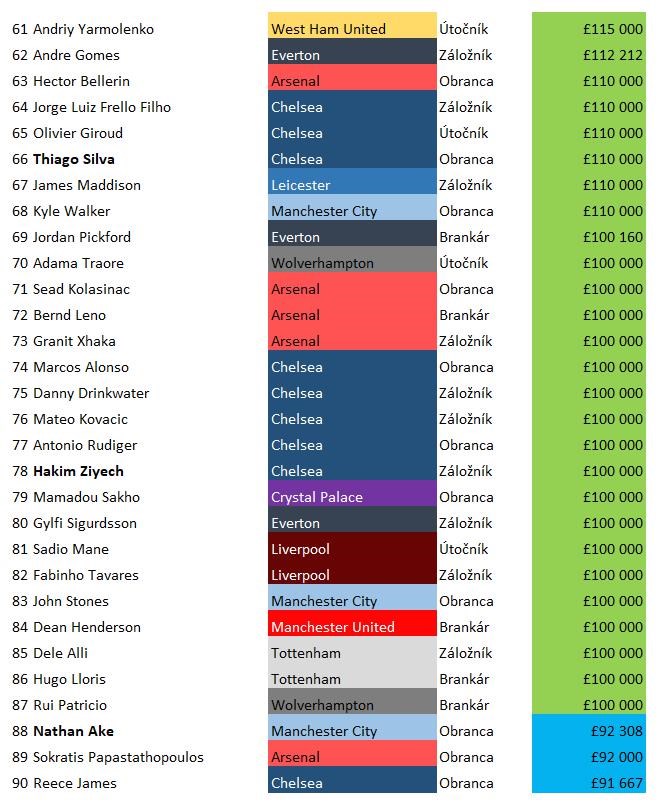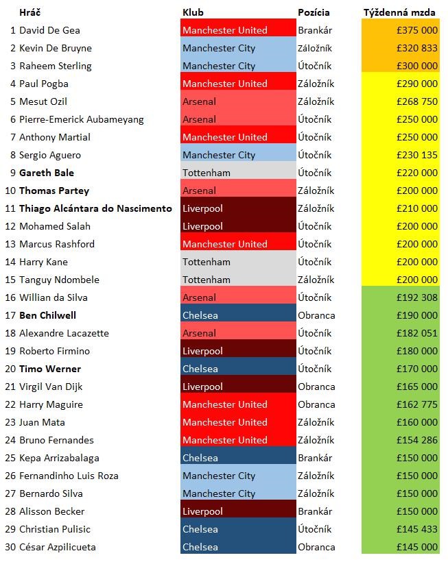 Minimálne 100 tisíc libier týždenne zarába 87 hráčov a v prvej stovke nenájdeme žiadneho zástupcu Newcastle, Southamptonu, Burnley, Brightonu a Sheffieldu United.