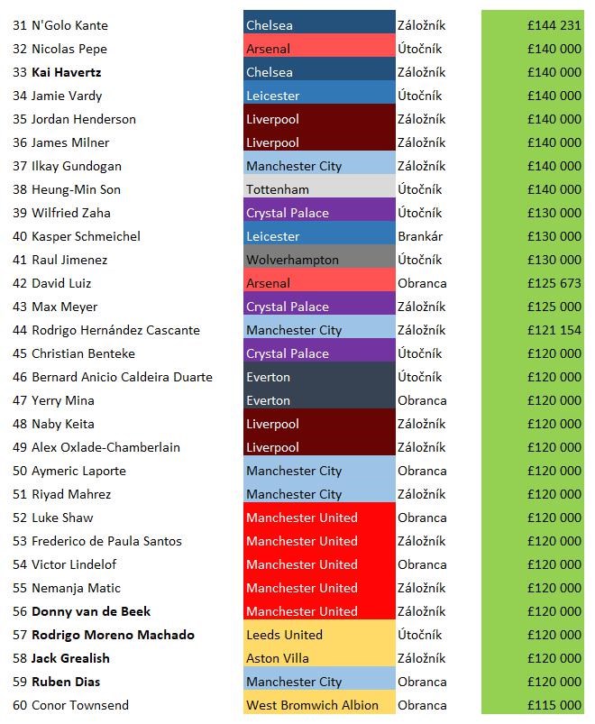 Najvyššie platy v kádroch Liverpoolu a Chelsea majú nové letné posily Thiago Alcantara a Ben Chilwell. Z tímov mimo top šestky je v tabuľke najvyššie Jamie Vardy z Leicesteru na 34. respektíve Wilfried Zaha z Crystal Palace na 39. priečke.