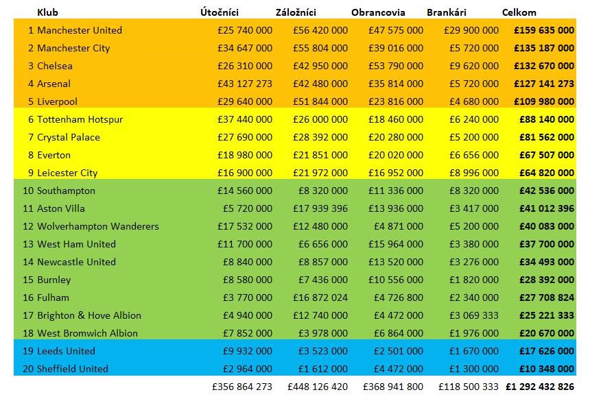 Na spodku tabuľky je osamotený Sheffield United, ktorého náklady sú iba niečo vyše 10 miliónov libier za rok.
