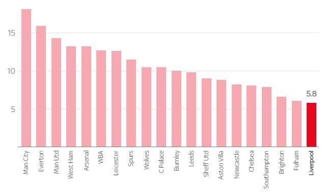 Tabuľka Premier League za kalendárny rok 2021V akom rozpoložení sa momentálne obhajca trofeje nachádza, hovorí aj strelecká efektivita, v ktorej je Liverpool v kalendárnom roku 2021 na úplne na poslednej priečke.