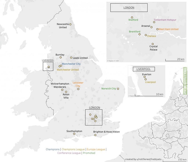 Medzi účastníkmi nájdeme šesť zástupcov z Londýna (Chelsea, Arsenal, Tottenham, West Ham, Crystal Palace, Brentford), dva kluby z West Midlands (Wolverhampton, Aston Villa) a po dvoch tímoch z Manchesteru (United, City) a Liverpoolu (Liverpool, Everton). Sever Anglicka zastupuje Newcastle, západ Anglicka Norwich, južné pobrežie dvojica klubov Southampton a Brighton a ligový pelotón dopĺňajú Leicester, Burnley, Leeds a Watford.