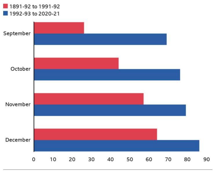 Za 99 rokov pred sformovaním Premier League iba 26% tímov, ktoré v septembri viedli tabuľku, skutočne aj získali ligový titul. V októbri to bola stále menej ako polovica klubov.