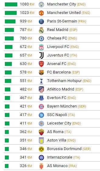 Nad miliardu eur sa v rebríčku dostali iba oba manchesterské kluby. K tejto hranici sa už priblížil iba Saint-Germain, ktorý je na tretej priečke s kádrom v hodnote 939 miliónov eur.