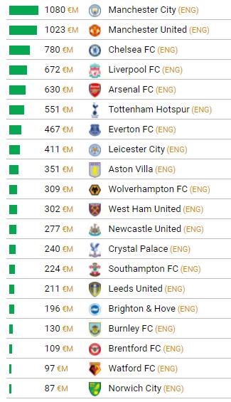 Ak si zoberieme priemer jednotlivých ligových súťaží, tak lídrom je samozrejme anglická Premier League s priemernou hodnotou kádra 407 miliónov eur. Francúzska Ligue 1 je na poslednej priečke s priemernou hodnotou kádra 130 miliónov eur.