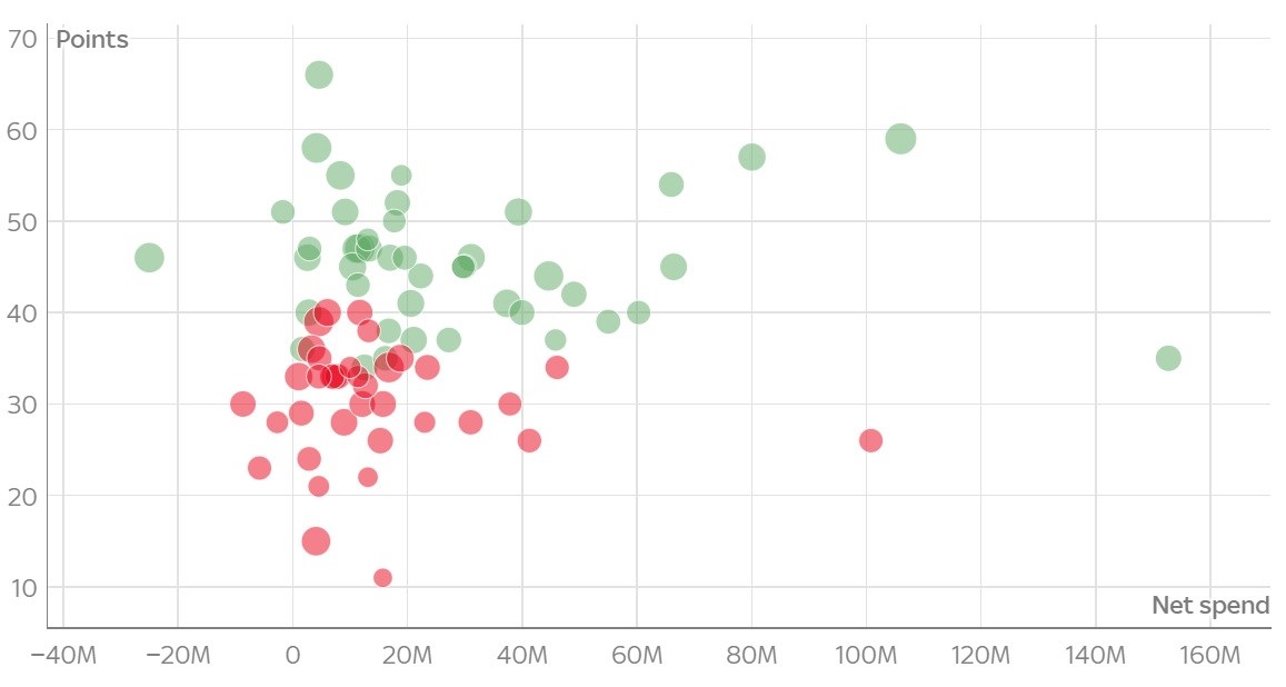 Aston Villa v roku 2020 po rekordných čistých výdavkoch vo výške 152,7 milióna libier prežila medzi elitou iba o chlp. Leeds dosiahol umiestnenie v prvej polovici ligovej tabuľky po investíciách vo výške 106 miliónoch libier. V skutočnosti prežilo až osem z 10 najviac investujúcich klubov - iba Fulham a Cardiff sa nedokázali udržať, oba kluby v roku 2019.