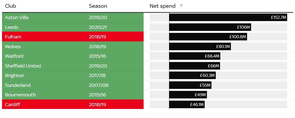 Nižšie uvedená tabuľka poskytuje ešte väčšiu prehľadnosť - iba jeden tím s výdavkami presahujúcimi 50 miliónov libier vo svojej prvej sezóne zostúpil nižšie - Fulham v sezóne 2018/19. Zvyšných sedem klubov prežilo.