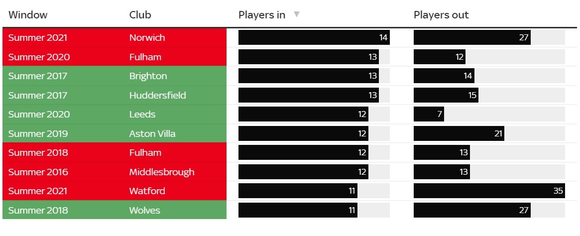 Ako nám ukazuje tabuľka nižšie, Norwich získal minulé leto najviac hráčov (14). Napriek tomu sa v súťaži nezachránil.