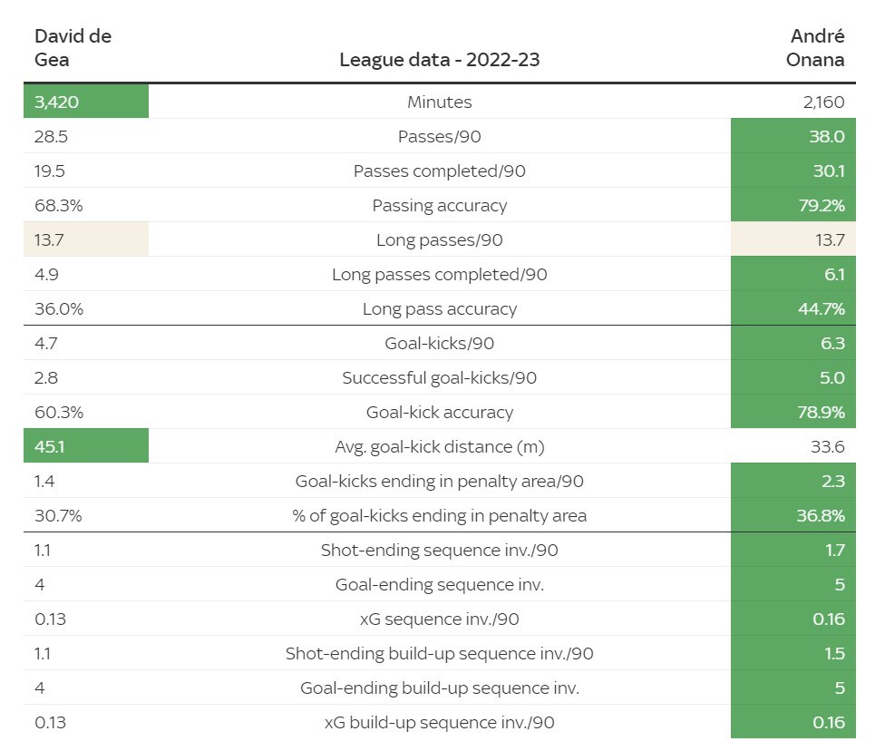 Keď porovnáme ligové štatistiky oboch brankárov v minulom období, Onana inkasoval menej gólov za 90 minút a zaznamenal vyššie percento zákrokov v Serie A, hoci De Gea bol podľa xG o niečo viac vyťaženým brankárom, udržal si viac čistých kont a dosiahol lepší pomer inkasovaných gólov.