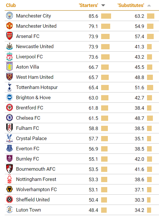 Ak zoberieme do úvahy iba anglickú Premier League, tak za Manchesterom City je na druhej priečke jeho mestský rival Manchester United (79,1 a 54,9) a "bronzovú" priečku obsadil Arsenal (73,9 a 57,4). Z klubov tzv. "veľkej šestky" je Liverpool na piatej, Tottenham na ôsmej a Chelsea dokonca až na jedenástej priečke. Newcastle obsadil výbornú štvrtú priečku.