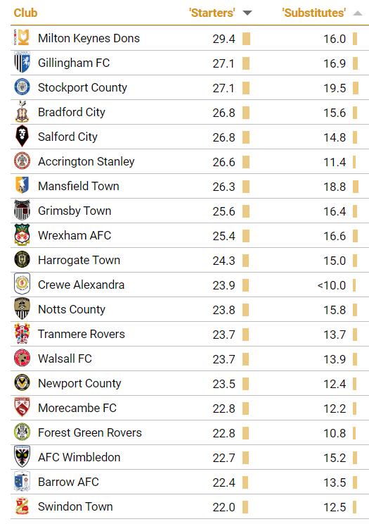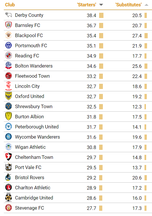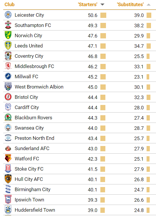 V Championship najvyššiu hodnotu dosiahol Leicester City (50,6 a 39,0), v League One je lídrom Derby County (38,4 a 20,5) a v League Two Milton Keynes Dons (29,4 a 16,0).