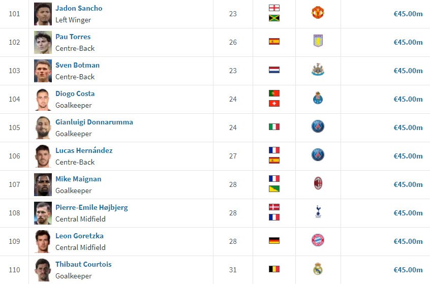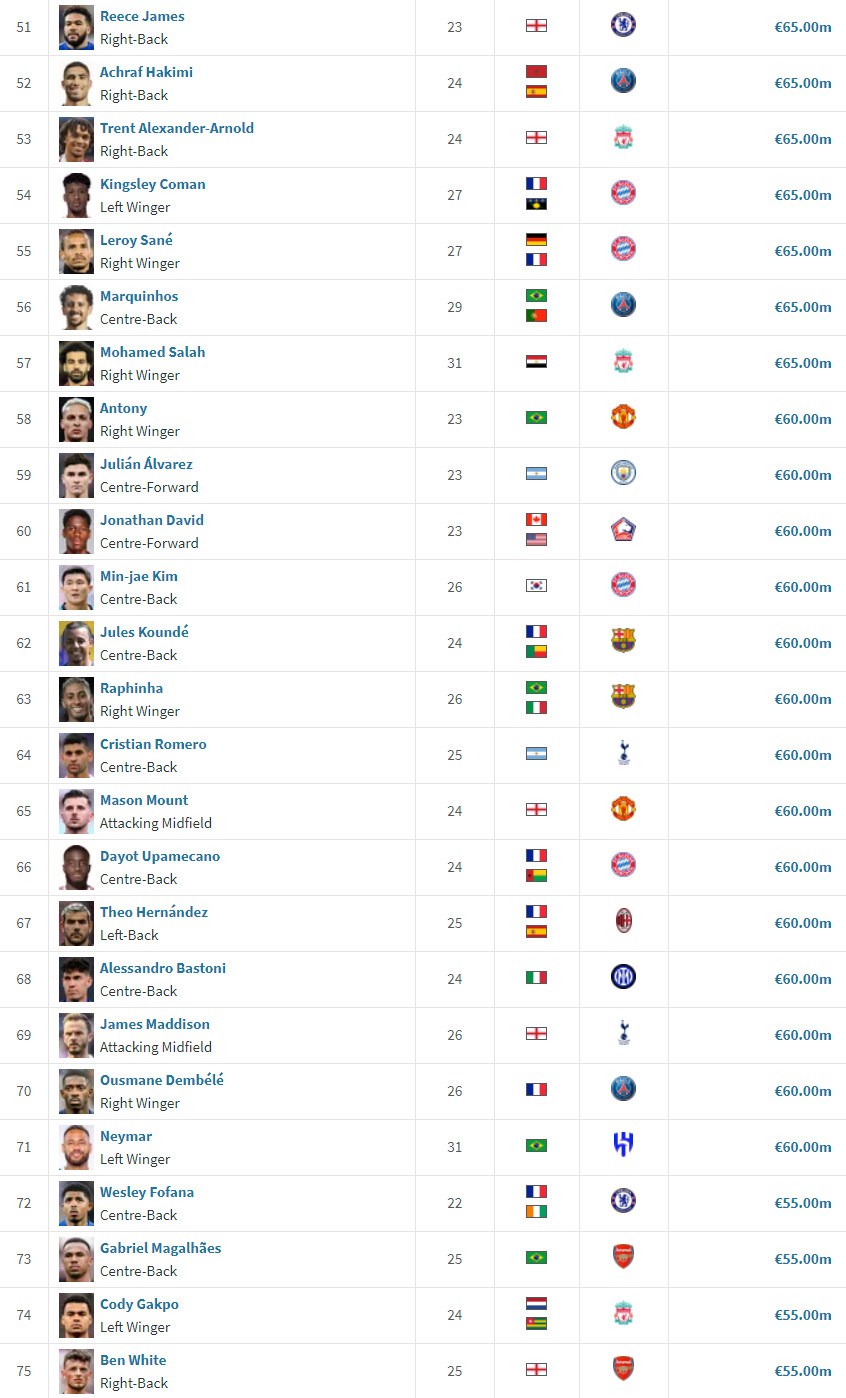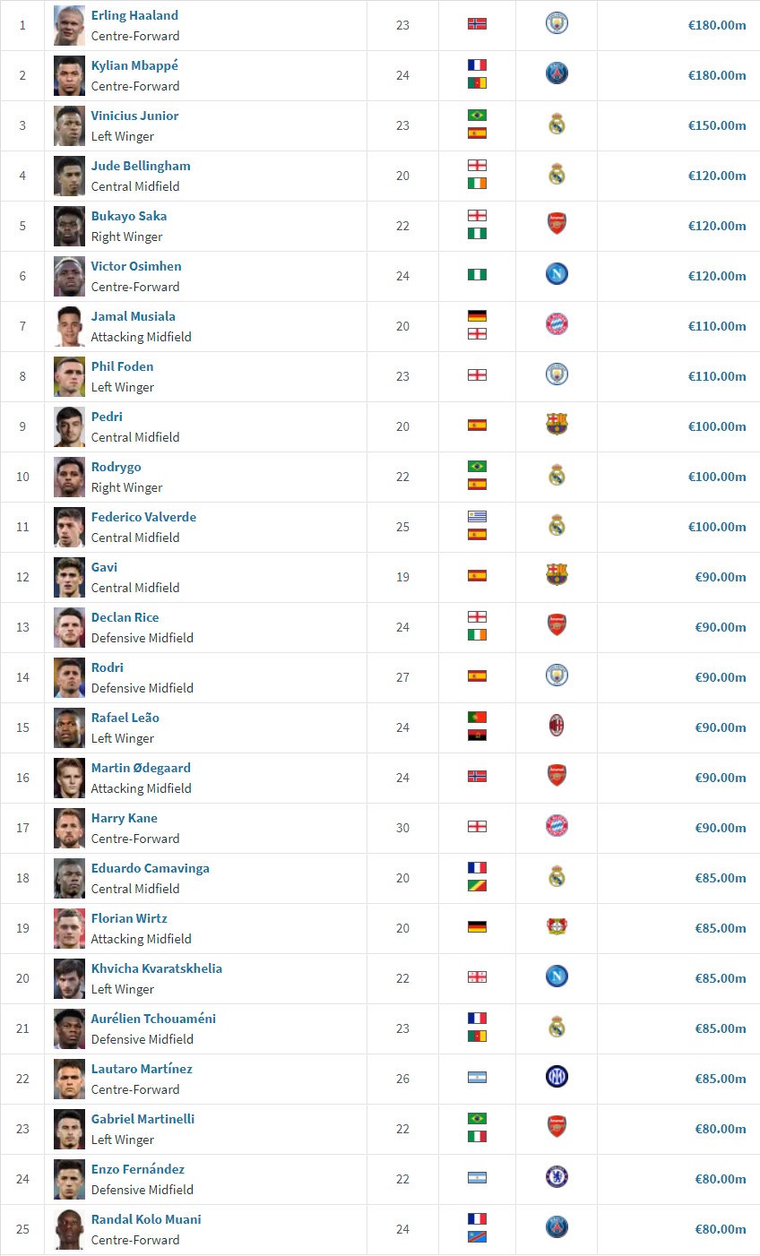 Nie je prekvapením, že rebríček (ako zvyčajne) ovládli útočníci. Ak sa pozrieme na ostatné pozície, tak medzi brankármi je najvyššie štvorica Costa, Donnarumma, Maignan, Courtois (všetci 45 mil.eur). Najvyššie medzi obrancami sú spoluhráči s Man City Ruben Dias (80 mil.eur) a Josko Gvardiol (75 mil.eur). A napokon záložnej formácii dominuje nová posila Realu Madrid Jude Bellingham (120 mil.eur).
