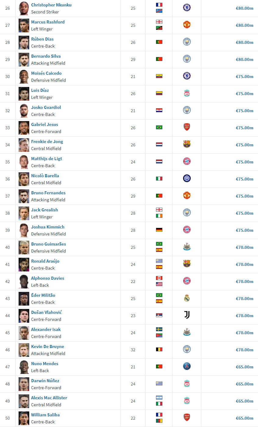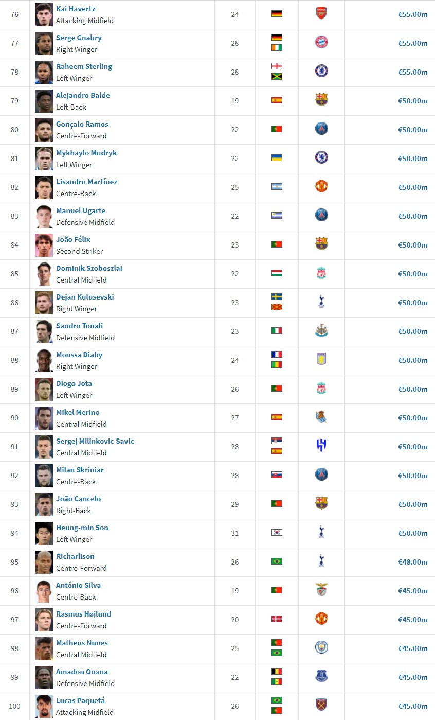 Najstarším zo 110 najhodnotnejších hráčov je Kevin De Bruyne z Manchesteru City, ktorý má 32 rokov a jeho trhová hodnota je 70 miliónov eur, čo stačí na delené 40. miesto. Celkovo je v rebríčku šesť hráčov vo veku 30 rokov a viac a len traja tínedžeri: hviezdy Barcy Gavi a Alejandro Balde a obranca Benficy António Silva - všetci traja majú 19 rokov.