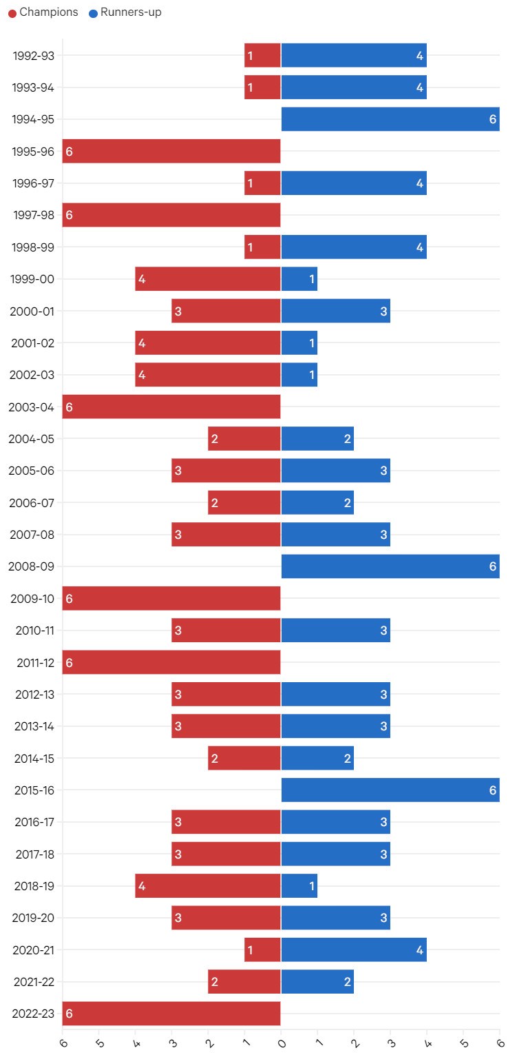 Ľavá os predstavuje bodový rozdiel medzi prvým a druhým tímom, pričom žlté bodky označujú skutočný bodový rozdiel medzi prvými dvoma tímami. Napríklad v sezóne 1992/93 bol rozdiel medzi prvým a druhým 10 bodov.