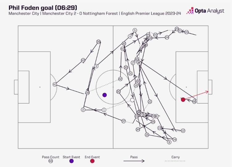 Najdlhšiu prihrávkovú sekvenciu City vedúcu ku gólu zakončil Foden svojím prvým - a zatiaľ jediným - gólom v sezóne.