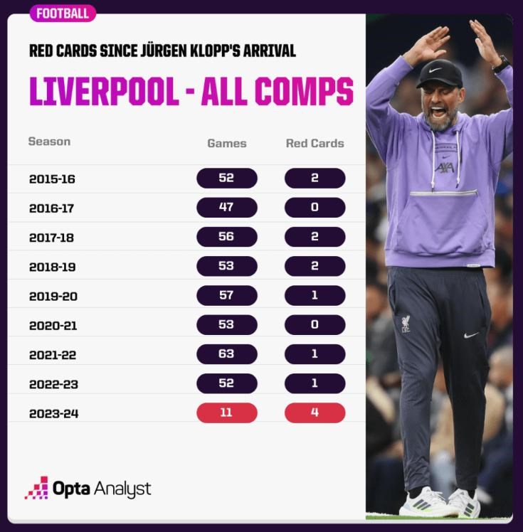 Nechcený rekord pre Liverpool, ktorý v žiadnej z predchádzajúcich sezón, keď bol Jürgen Klopp v klube, nedostal viac ako dve červené karty za celú sezónu.