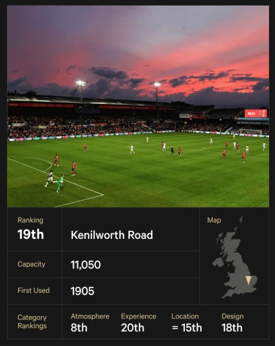 Domov Lutonu na viac ako 100 rokov bol jedným z najväčších príbehov leta po postupe klubu do Premier League. Kenilworth Road, ktorý naposledy hostil najvyššiu súťaž v roku 1992, je ako futbalové múzeum. Fungujúci príklad toho, ako sa futbalové štadióny najprv etablovali s väčšinou drevenými, nízko zastrešenými, plytkými terasami, na ktorých sa odvtedy inštalovali sedadlá. Tieto tribúny sa nachádzajú vedľa novej, dočasnej tribúny Bobbers Stand, ktorá umožňuje, aby si štadión plnil svoje povinnosti v Premier League. Vchod na tribúnu Oak Stand cez neďaleké domy je dnes známy na celom svete. Dni tohto štadióna sú spočítané, pretože Luton plánuje postaviť nový účelový štadión na druhej strane mesta.