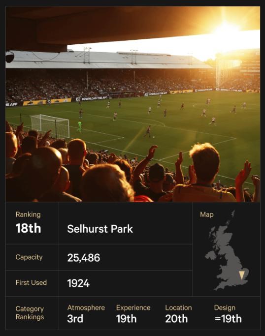 Selhurst Park, jedno z dejísk letných olympijských hier v roku 1948, je tradičným ihriskom, ktoré si zachovalo svoj charakter a zároveň sa dostatočne modernizovalo. Najnovšou časťou štadióna je pozoruhodná tribúna Holmesdale Road, dokončená v roku 1994. Štadión možno poznáte ako Nelson Road, fiktívny domov AFC Richmond vo filme Ted Lasso. Plánuje sa prestavba Selhurst Parku za 150 miliónov libier (185 miliónov USD), pričom väčšina formálnych prekážok je už odstránená.
