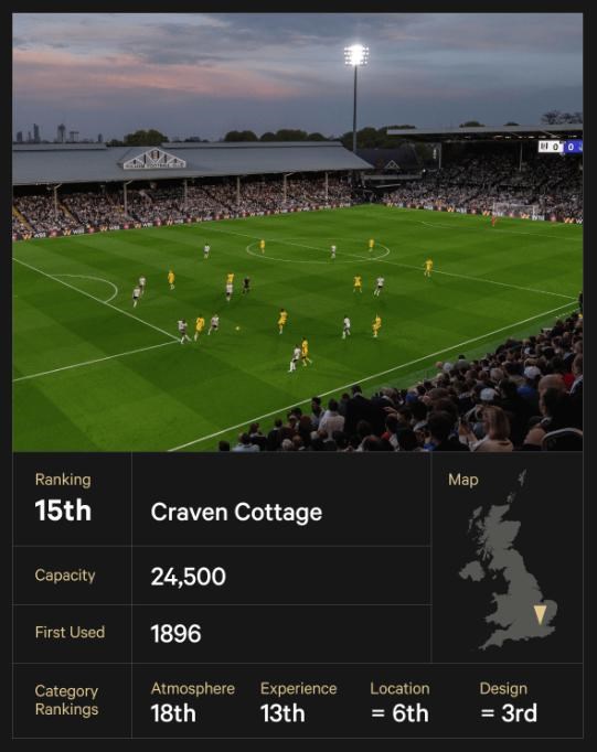 História štadióna Craven Cottage, na ktorom domáce zápasy hráva Fulham, siaha viac ako 125 rokov dozadu a predstavuje jeden z najtypickejších štadiónov v Anglicku. Je pomenovaný podľa chaty, ktorú postavil William Craven v roku 1780 a ktorá stále stojí v jednom z rohov štadióna. Pozdĺž celého štadióna sa tiahne zdobené priečelie historickej tribúny Johnny Haynes Stand - najstaršej zachovanej tribúny v anglickom profesionálnom futbale. Oproti nej stojí zrekonštruovaná tribúna Riverside.