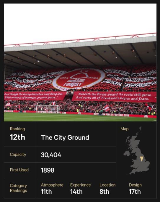 Okrem prvých 14 rokov existencie klubu Forest sa všetky zápasy odohrali na štadióne The City Ground. Štadión sa nachádza na brehu rieky Trent a od roku 2019 sa plánuje prestavba tribúny Peter Taylor Stand. Vlani získali stavebné povolenie, hoci blízkosť štadióna k rieke môže veci skomplikovať.