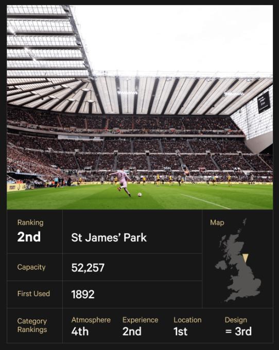 St James' Park, dlhodobý domov Newcastle United, sa nachádza na kopci v centre mesta. Návštevníkov priťahuje ako maják, ktorý vyčnieva nad panorámou mesta. Vzhľadom na rozsiahlu prestavbu dvoch tribún v roku 1998 môže pôsobiť architektonicky chladne a klinicky, ale poskytuje autentickú atmosféru ako žiadna iná v Premier League.