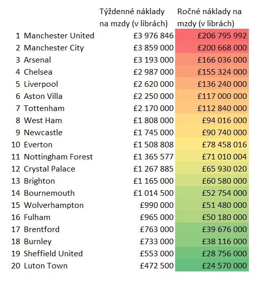 Oba manchesterské kluby absolútne jednoznačne dominujú rebríčku klubov Premier League v mzdových nákladoch, keď iba tieto dva tímy sa dostali cez hranicu 200 miliónov libier ročne. Na prvom mieste je United, v tesnom závese je jeho mestský rival City.