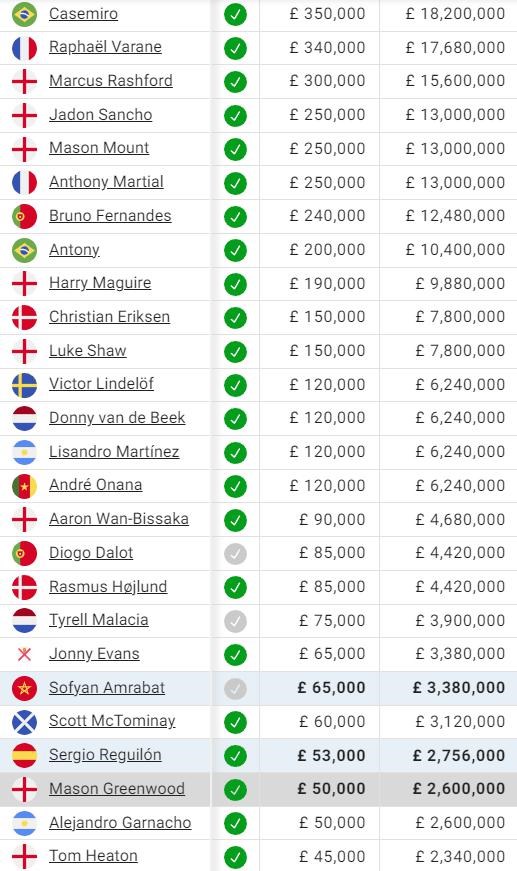Nasleduje ich trojica anglických hráčov Rashford, Mount (letná posila z Chelsea) a Sancho. Posledne menovaný je zrejme na odchode z klubu pre nezhody s manažérom ten Hagom. K slušným peniazom si prídu aj Martial, Fernandes a Antony, ktorí sú tiež na alebo nad hranicou 200-tisíc libier za týždeň.