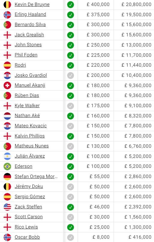 Vysoké pozície má aj trojica anglických reprezentatov Grealish, Stones a Foden, rovnako ako obranca Gvardiol, ktorý do klubu prišiel v lete. Nad plat cez 200-tisíc týždenne sa dostali aj záložníci Silva a Rodri.