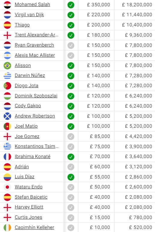 Všetci ostatní hráči majú plat nižší ako 100-tisíc libier týždenne, pričom najvyššie je umiestnený 35-ročný veterán Adam Lallana, ktorému tiež končí kontrakt už budúce leto.