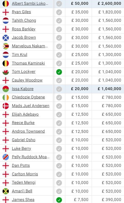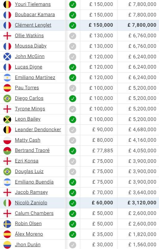 Vpredu sa drží trojica Tielemans, Kamara a Lenglet, ale nad 100-tisíc libier sa drží ďalších deväť hráčov, vrátane vo výbornej forme hrajúceho Watkinsa, ktorý s Villans podpísal pred pár dňami nový kontrakt.