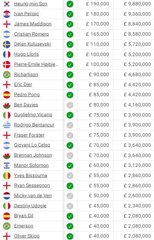 Najvyššie sa drží kapitán Son, nasledovaný Ivanom Perisicom, ktorému už budúce leto končí kontrakt a z klubu zrejme odíde. Nová hviezdna posila z Leicesteru Maddison je na tretej priečke a vo vyšších poschodiach sa nachádza už iba obranca Romero.